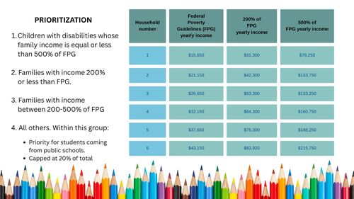 All students may apply and have a chance to be chosen each year, but students are chosen according to a prioritization system. The highest priority groups will be children with special learning needs and from low-income families. Families can reapply each year until they are chosen. Once your students are in the program, they are in for the duration. The family will not need to reapply each year after that. Unused funds may roll over each year with no rollover limit while the student participates in the program.